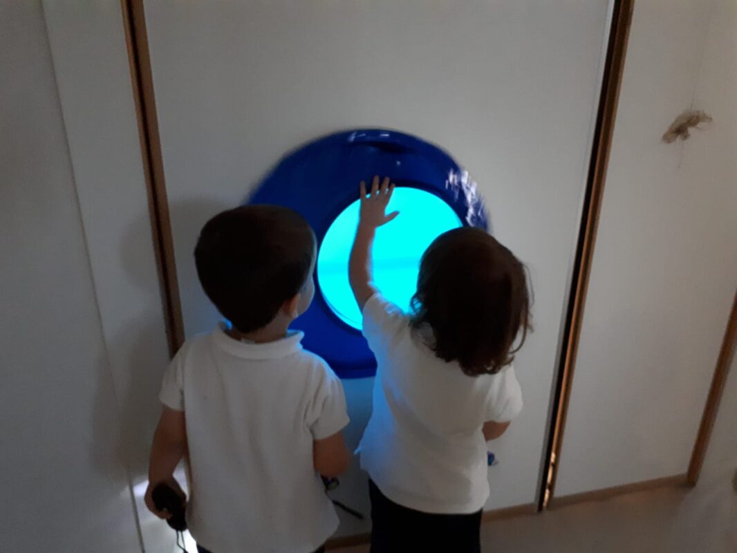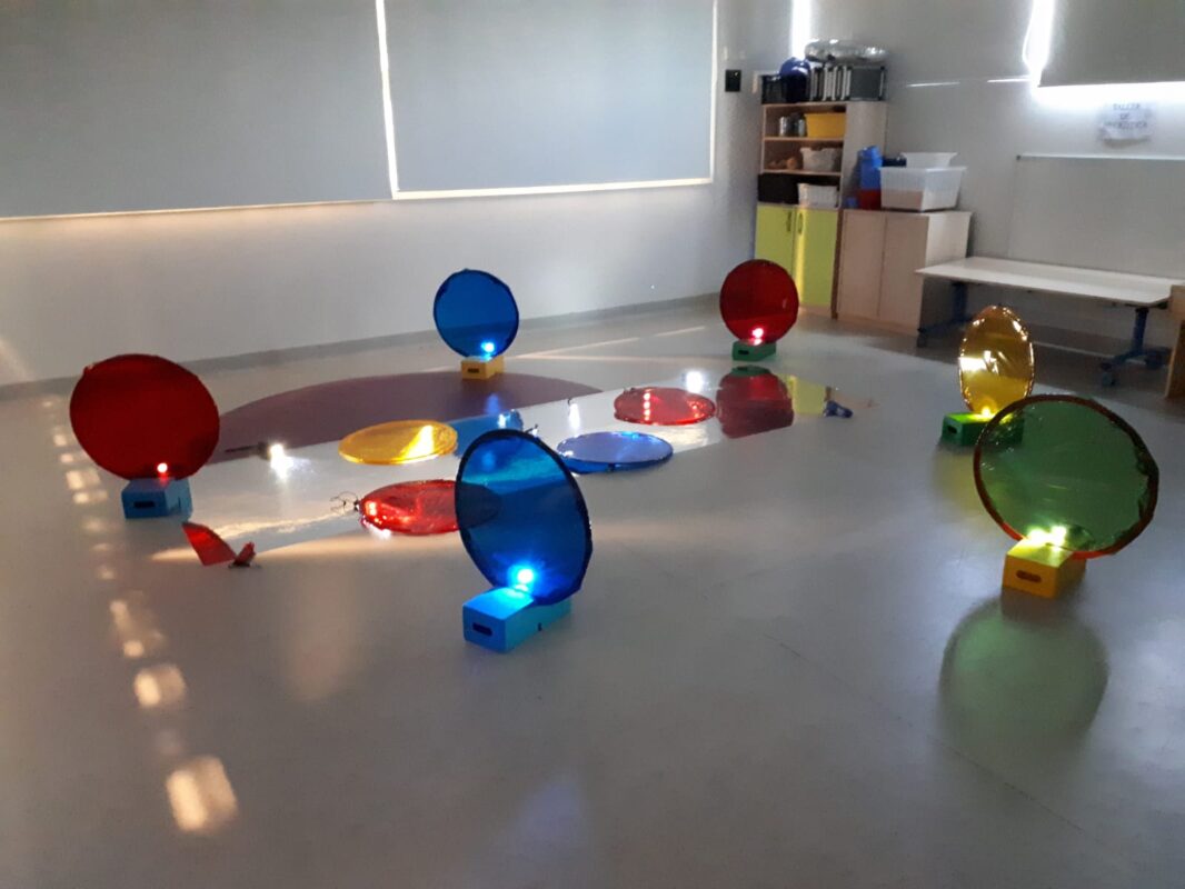 Esta vez queremos invitar al movimiento con la propuesta de luz y color, así que lo hemos preparado para que así sea. Un escenario de juego que ha despertado la curiosidad y el movimiento de sus participantes. Y el objetivo principal, que era descubrir los colores a través de la luz de las linternas, lo hemos cumplido de sobra, tanto con los materiales propuestos, como rasgando el papel de color para ponerlo directamente sobre la linterna o explorando otras fuentes de luz, como la ventana de la puerta…