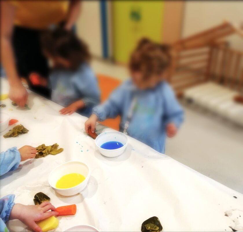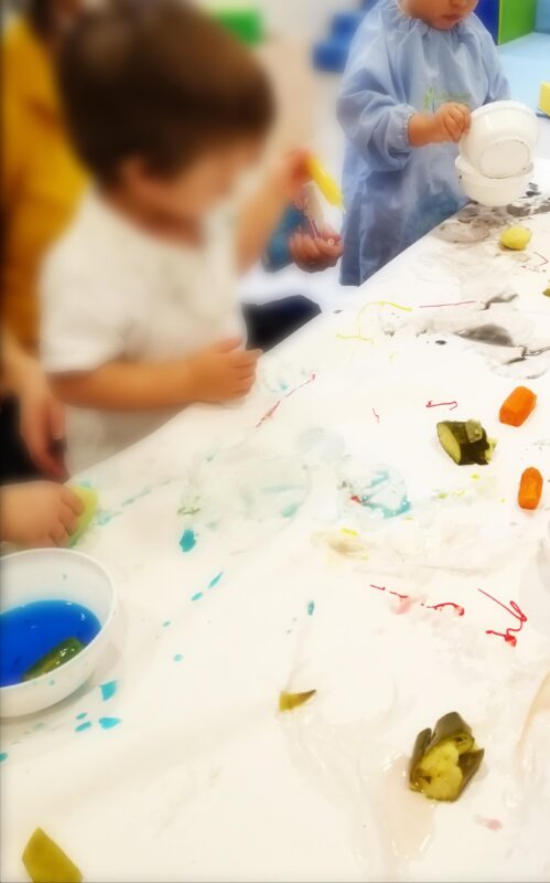 A través de los sentidos descubren las cualidades de los elementos propuestos: liquido, sólido, duro, blando, frío, caliente, los colores…y con sorpresa experimentan las consecuencias de la acción sobre ellos! Aplastan, extienden, mojan y dejan escurrir…expresándose con libertad.