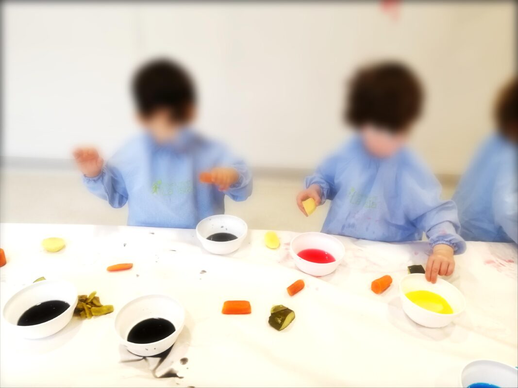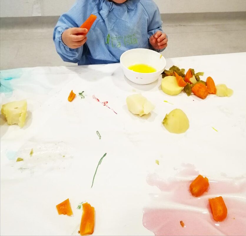 En esta ocasión ofrecemos distintas verduras, crudas y cocidas y recipientes con pinturas de distintas texturas y consistencias para libremente manipular.